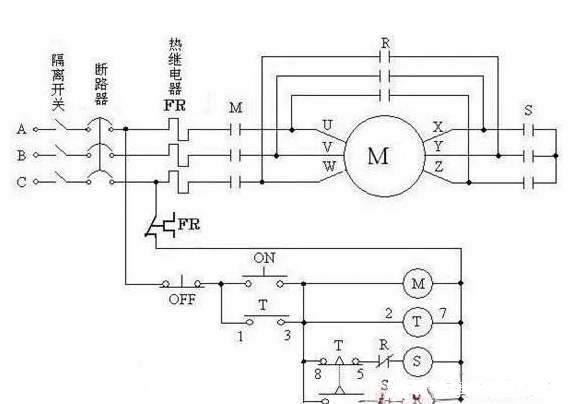 R接觸器,為啟動(dòng)之后,把電機(jī)繞組首尾連接起來(lái)。即U-Z,Y-W,X-V三個(gè)繞組的三角形接法。 T時(shí)間繼電器,起動(dòng)時(shí),比如要讓電機(jī)在5秒內(nèi)完成起動(dòng)進(jìn)入正常運(yùn)轉(zhuǎn)狀態(tài),就可把時(shí)間繼電器設(shè)定到5秒