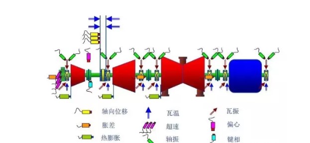 連續(xù)監(jiān)測(cè)轉(zhuǎn)子相對(duì)于汽缸上一基準(zhǔn)點(diǎn)(一般為推力軸承)的膨脹量,通常采用電渦流傳感器進(jìn)行測(cè)量,也是保護(hù)轉(zhuǎn)子與靜子部件之間不發(fā)生摩擦的重要信號(hào),當(dāng)脹差過(guò)大時(shí)發(fā)出報(bào)警或者停機(jī)信號(hào)。