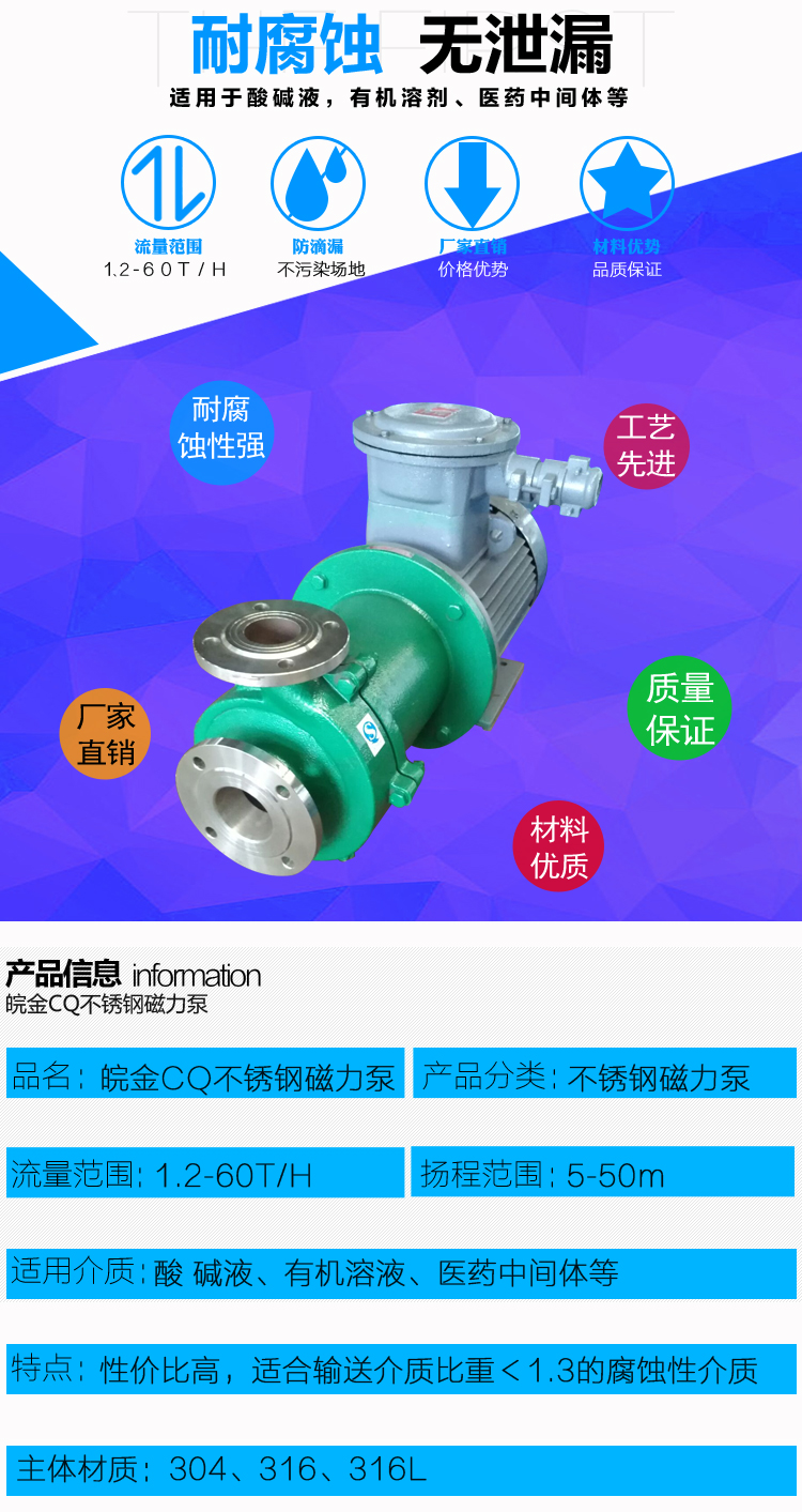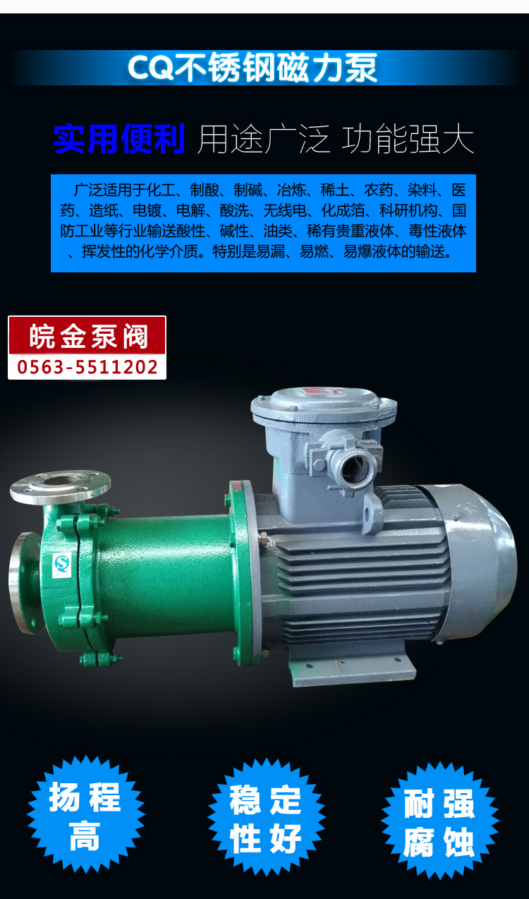 JCQ不銹鋼磁力泵是很早應(yīng)用的無泄漏不銹鋼泵,過流部件采用不銹鋼制成,是公司原CQ型升級(jí)產(chǎn)品,應(yīng)用于石油、化工、制藥、電鍍、環(huán)保、污水處理、酸洗等行業(yè)在金屬泵市場(chǎng)上該產(chǎn)品具有價(jià)格優(yōu)勢(shì)。產(chǎn)品結(jié)構(gòu)簡(jiǎn)單,體積小,噪音低。