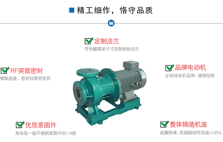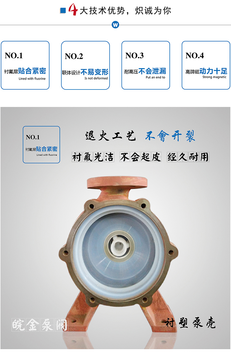 氟塑料磁力泵又稱其為氟塑料磁力離心泵、襯四氟磁力泵、氟塑料磁力驅(qū)動泵、耐腐蝕磁力化工泵,CQB-FJ襯氟磁力泵是我公司氟塑料磁力泵中的全新升級款型,產(chǎn)品性能好,運(yùn)轉(zhuǎn)更加穩(wěn)定,材質(zhì)更好,全封閉無泄露,適合現(xiàn)代化的環(huán)保要求。