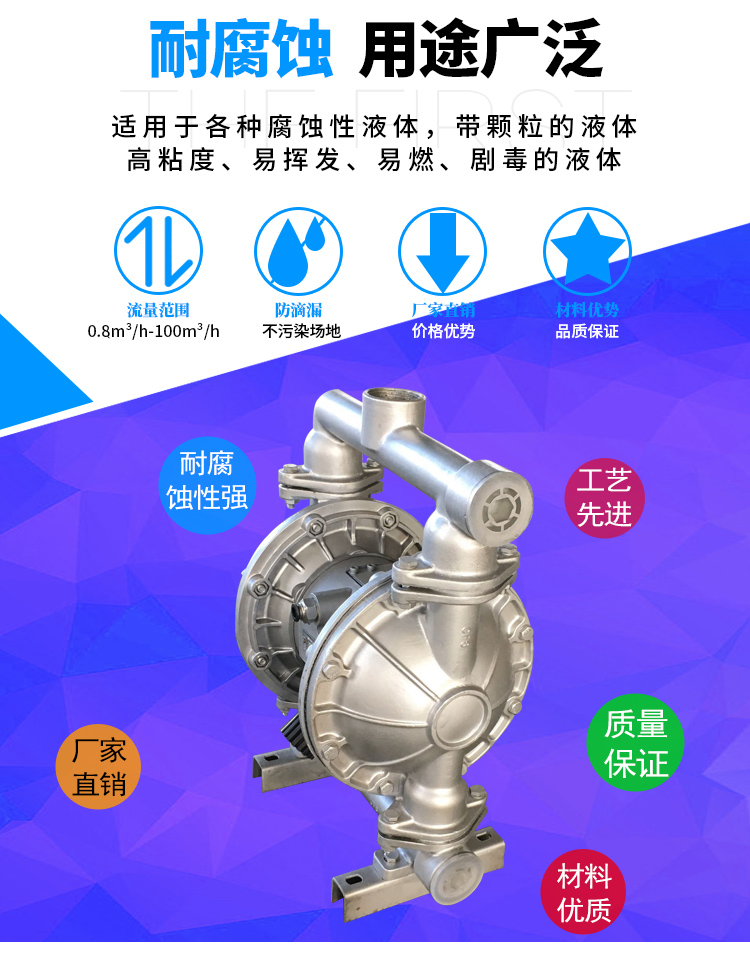 采用壓縮空氣為動(dòng)力源,對(duì)于各種腐蝕性液體,帶顆粒的液體,高粘度、易揮發(fā)、易燃、劇毒的液體,均能予以抽光吸盡,尤以適合易燃易爆場(chǎng)。