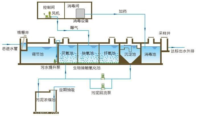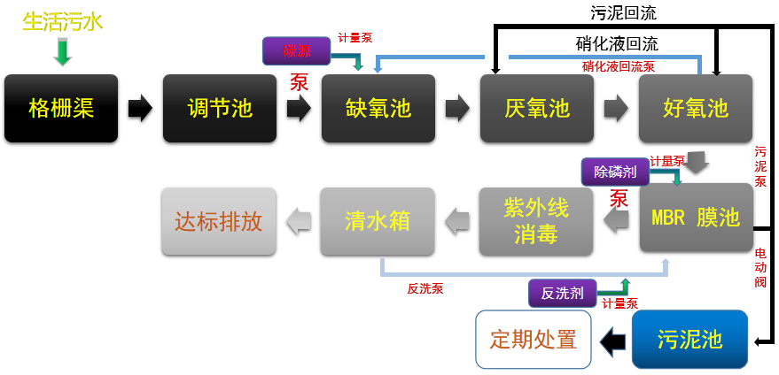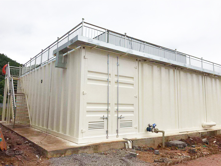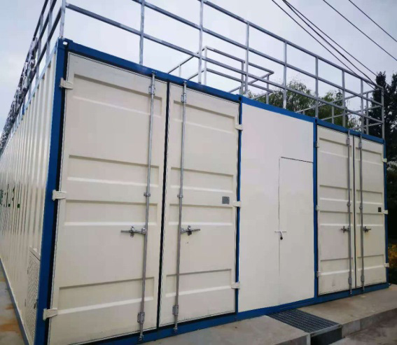 集裝箱式一體化污水凈化設(shè)備的重要部件是膜生物反應(yīng)器(MBR)。污水進(jìn)入MBR系統(tǒng),A區(qū)為兼氧區(qū),放置填料,并與活性污泥進(jìn)行充分接觸;O區(qū)為好氧區(qū),放置膜組器,使用MBR膜將活性污泥和大分子有機(jī)物質(zhì)截留住,省掉二沉池。活性污泥濃度因此提高,水力停留時(shí)間(HRT)和污泥停留時(shí)間(SRT)可以分別控制,而難降解的物質(zhì)在反應(yīng)器中不斷反應(yīng)、降解。進(jìn)一步處理之后,被處理水可以達(dá)標(biāo)排放或回用。此外,輸送到MBR系統(tǒng)中的空氣也是處理過程中重要的一部分,它可以促進(jìn)反應(yīng)器中流體的循環(huán)流動(dòng),提高活性污泥的降解效率,還可以使中空纖維膜膜絲之間發(fā)生相互摩擦,清潔膜組件。