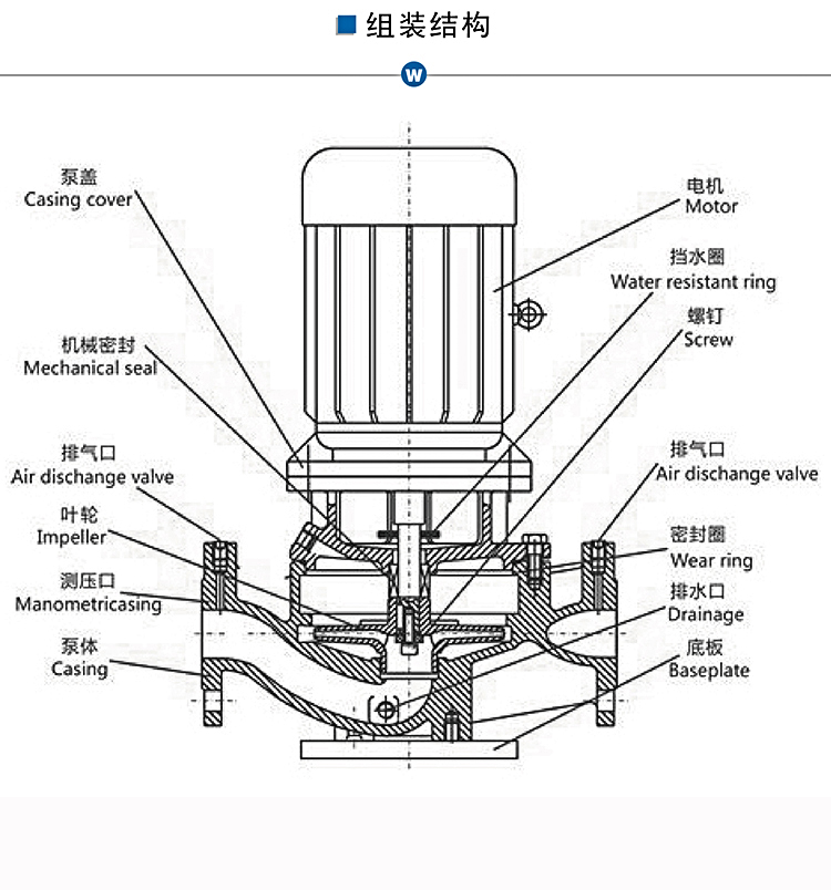 WJLG管道泵為立式結(jié)構(gòu),進(jìn)出口口徑相同,且位于同一中心線上,可象閥門一樣安裝在管路之中,外形緊湊美觀,占地面積小,建筑投入低,如加上防護(hù)罩則可置于戶外使用。葉輪直接安裝在電機(jī)的加長(zhǎng)軸上,軸向尺寸短、泵與電機(jī)軸承配置合理,能有效地平衡泵運(yùn)轉(zhuǎn)產(chǎn)生的徑向和軸向負(fù)荷,從而保證了泵的運(yùn)行平穩(wěn),振動(dòng)噪音很低。安裝檢修方便面,無需拆動(dòng)管路系統(tǒng),只要卸下泵聯(lián)體座螺母即可抽出全部轉(zhuǎn)子部件??筛鶕?jù)管路布置的要求采用泵的豎式和橫式安裝。ISG管道泵分基本型、分流型、切割型,材質(zhì)可選:鑄鐵、201、304、316L,等多種規(guī)格。