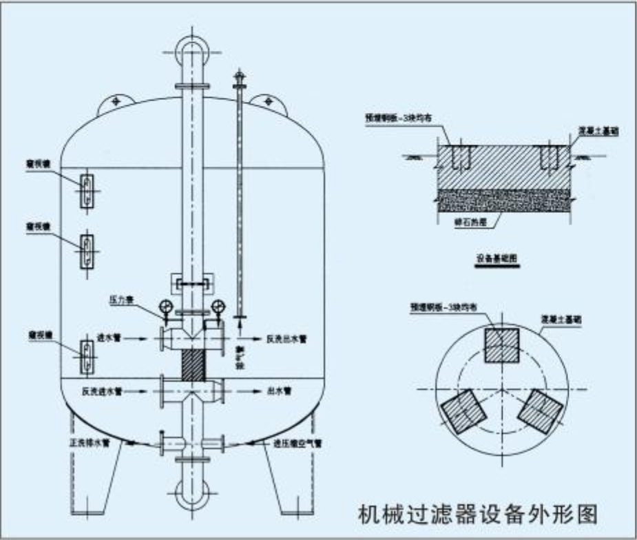 機(jī)械過濾器是利用一種或幾種過濾介質(zhì),在一定的壓力下, 使原液通過該介質(zhì),去除雜質(zhì),從而達(dá)到過濾的目的。其內(nèi)裝的填料一般為:石英砂、無煙煤、顆粒多孔陶瓷、錳砂等,用戶可根據(jù)實(shí)際情況選擇使用。