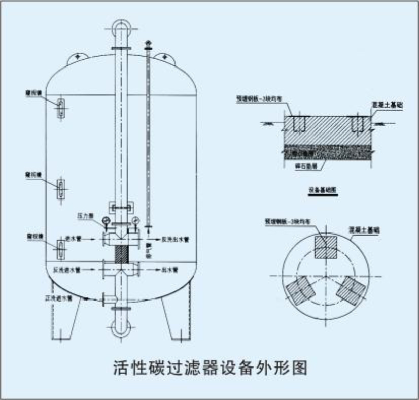 該活性炭過濾器主要由活性炭層和承托層組成?;钚蕴烤哂邪l(fā)達(dá)的孔隙,比表面積大,具有很高的吸附能力。正是由于活性炭的這種特性,它在水的深度處理中被廣泛使用,如生活給水,污水后段的(凈水)深度處理等。