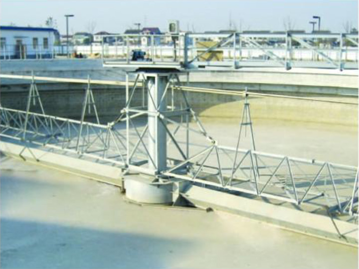 中心傳動(dòng)吸泥機(jī)主要由傳動(dòng)結(jié)構(gòu)、中心豎架、吸泥架、刮泥架、刮泥板及撇渣機(jī)構(gòu)等組成。污水從周邊進(jìn)入配水槽,經(jīng)槽底配水孔均勻地流入沉淀池,在周邊進(jìn)水擋板的作用下,水流從池底部流向中心,并從上部返回四周的出水槽內(nèi)。周邊配水槽采用變斷面配水孔不均勻分布設(shè)計(jì),以保證周邊配水的均勻性,驅(qū)動(dòng)裝置帶動(dòng)固定在桁架上的變徑吸泥管沿池底緩慢旋轉(zhuǎn),由吸泥管上特殊設(shè)計(jì)的系列孔口以靜水壓力為動(dòng)力將沉積在池底的污泥吸至吸泥管中,從排泥筒排出,浮渣刮板將沉淀池表面的浮渣刮至集渣斗,排出池外。