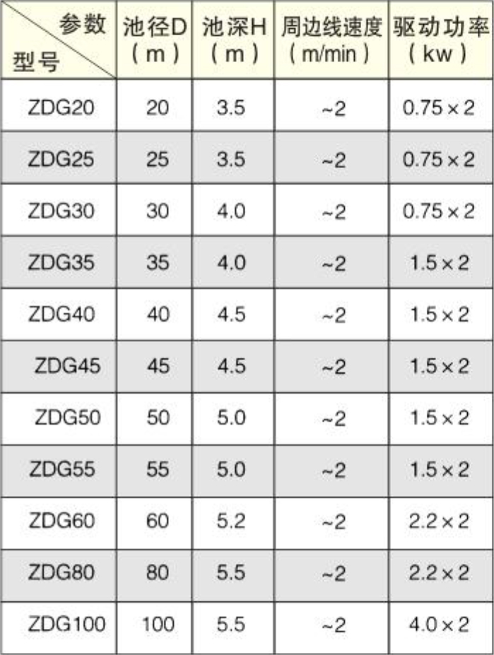 本機(jī)型為雙周邊驅(qū)動(dòng),中心支墩式,上部設(shè)有浮渣收集裝置,采用中心配水,利用液位差自吸式排泥,適宜的直徑范圍大于18米。