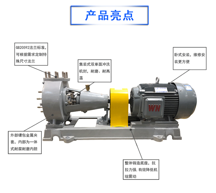可根據客戶需要配置相應的沖洗方案,廣泛應用于酸洗,環(huán)保脫硫,脫硝,化工,造紙,染料污水處理等領域。改泵運行穩(wěn)定,抗汽蝕性能強,特別合適含有顆粒雜質的酸堿性有腐蝕介質。具有高效節(jié)能,噪音振動低,可靠性高,壽命長,品質好、且價格公道合理等優(yōu)點,是化工,酸洗,環(huán)保,脫硫,污水處理的理想輸出設備。