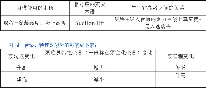 工業(yè)泵用戶一般要求泵的吸程(從吸入液面到泵吸入口的中心的垂直高差)高, 但國內(nèi)的泵標準及規(guī)范里,似乎沒有吸程這一術語。與它相關的術語是必須空化余量,約等于10-吸程(m, 沒有考慮吸入阻力)。我們認為可以將吸程與國內(nèi)外的相關術語及相互之間的關系作如下對照: